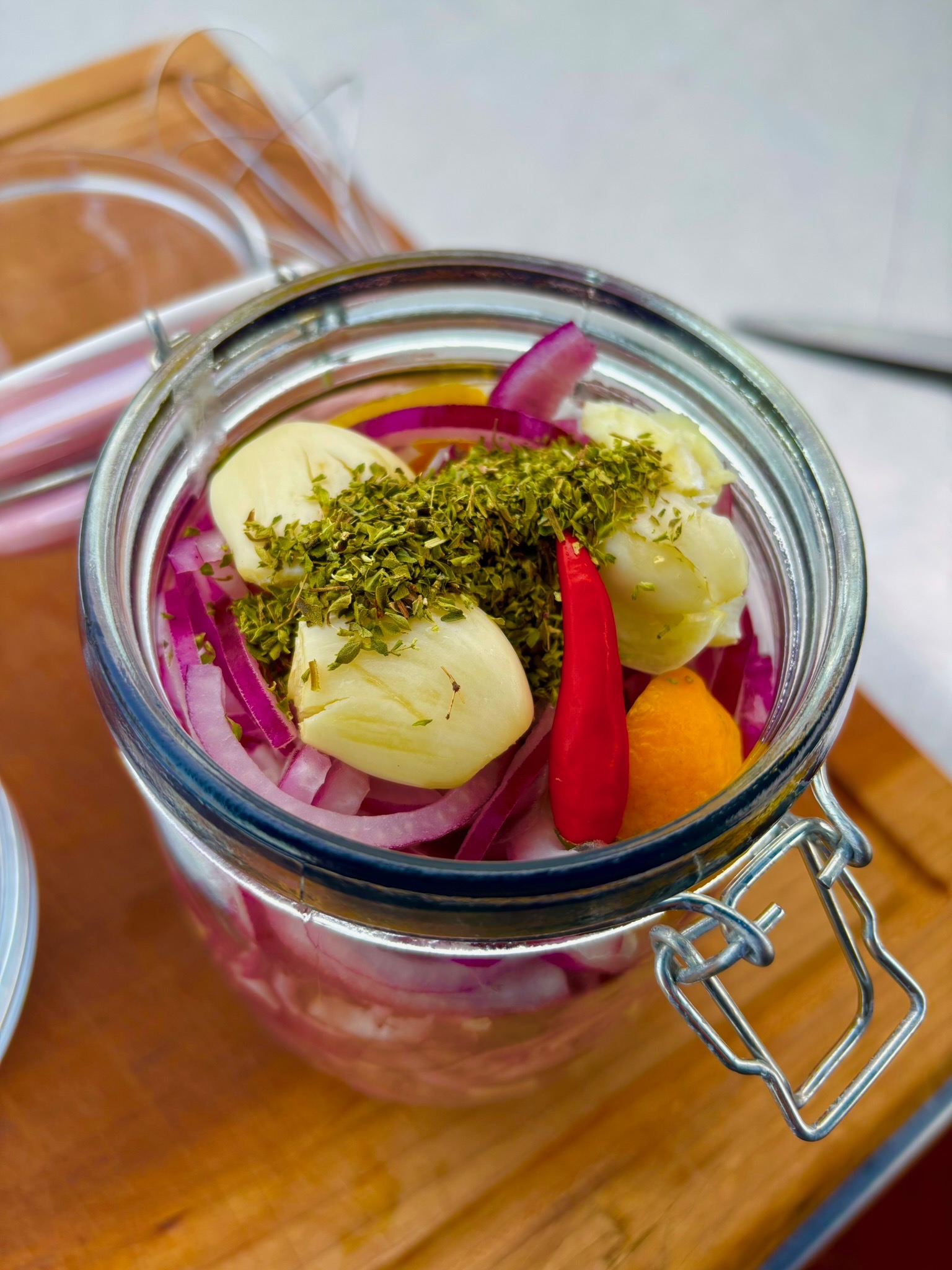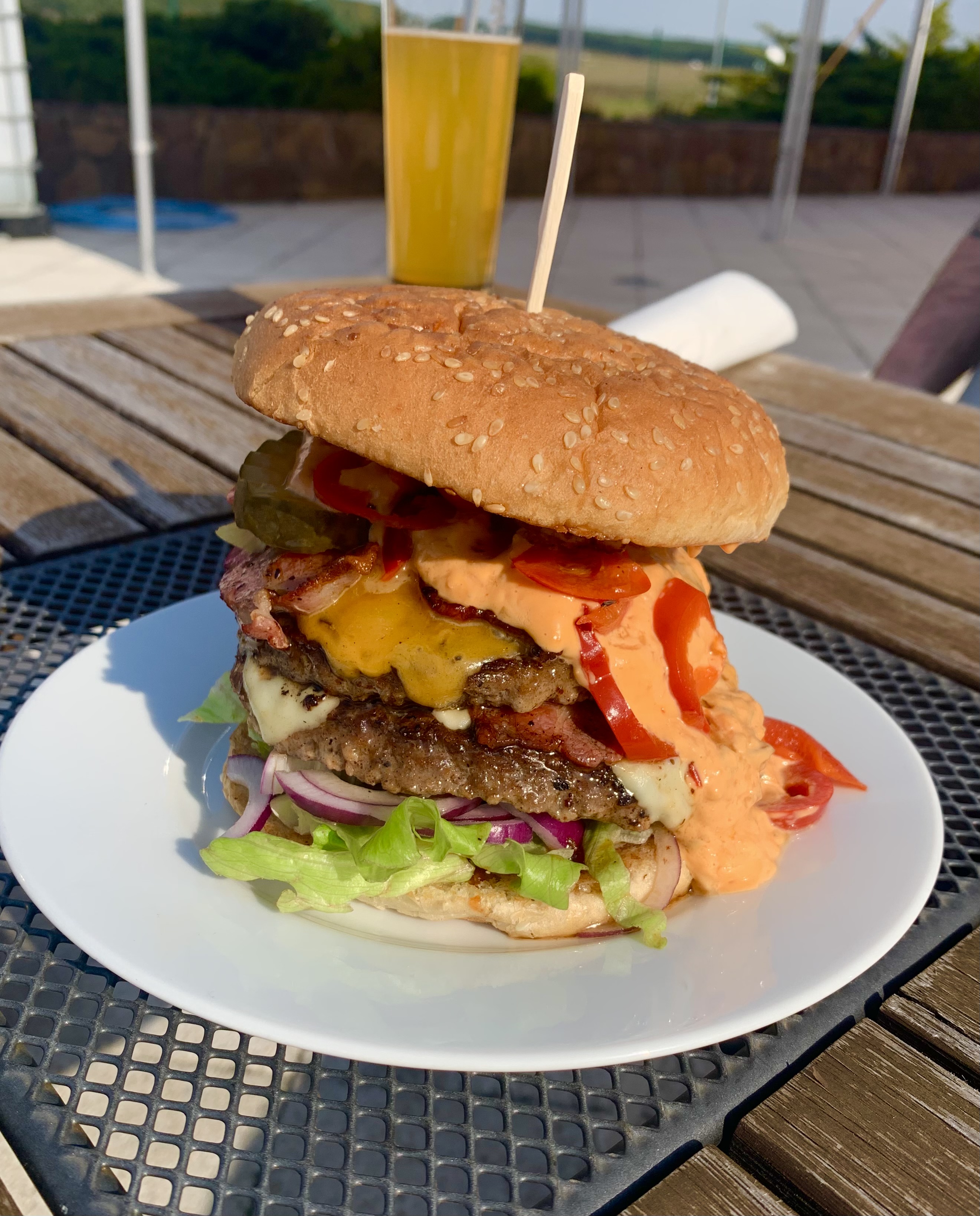 - Smash Burger mit hauseigenen Dressing und eingelegte Rote Zwiebeln